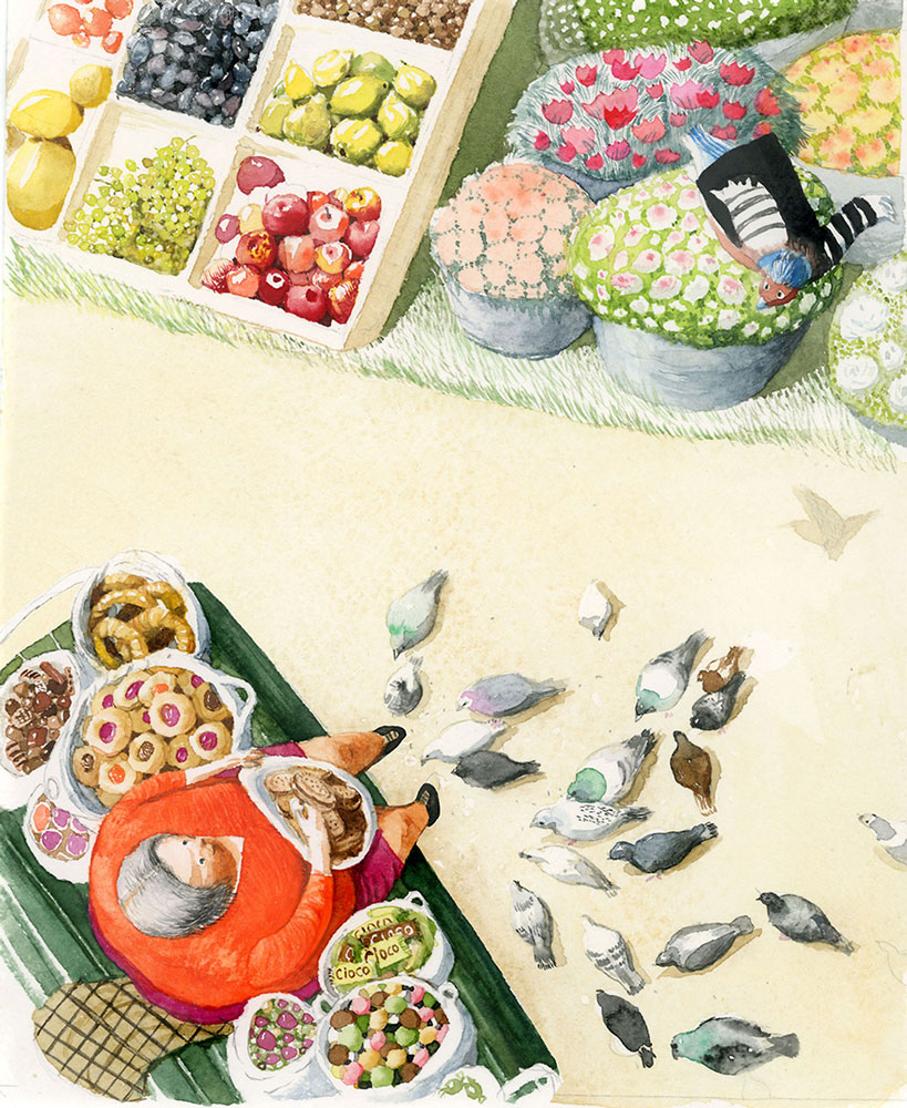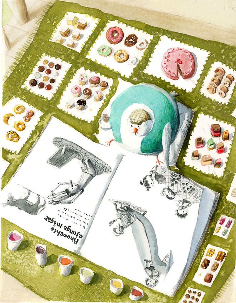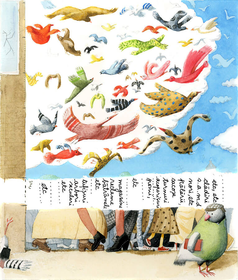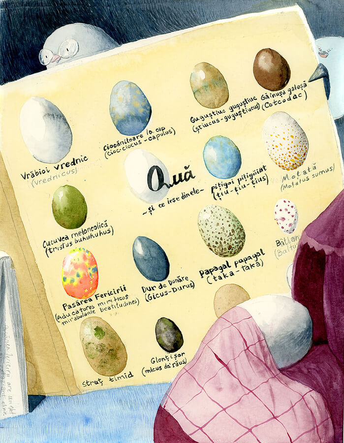 In Lavinia Braniște‘s Evadarea lui Moș Columb, Moș Columb, a kind-hearted pigeon, helps the finch Alexei care for his soon-to-hatch chick. However, Moș Columb loves being around people and eating bread crumbs and biscuits all day, which causes him to gain weight and makes flying quite difficult. When his favorite old lady from the park takes him home and starts feeding him cakes, the birds in the pine tree where Columb lives must embark on a rescue mission to save him.
